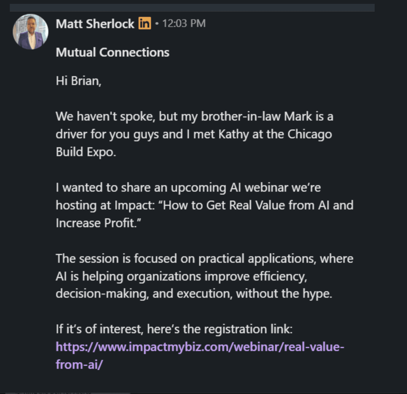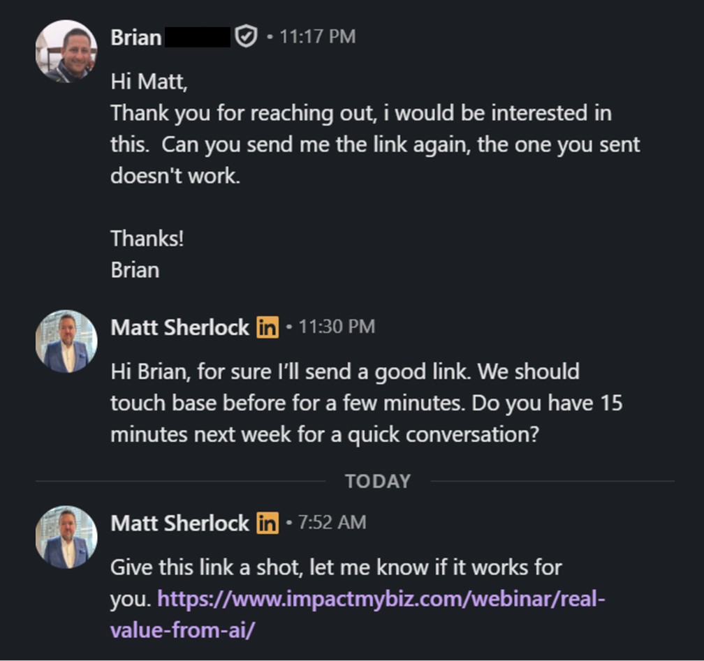 This question works because it's disarming. It simply opens a conversation based on something that actually happened. The response rate on profile viewer outreach is about 41% when I do this or coach others on the approach.