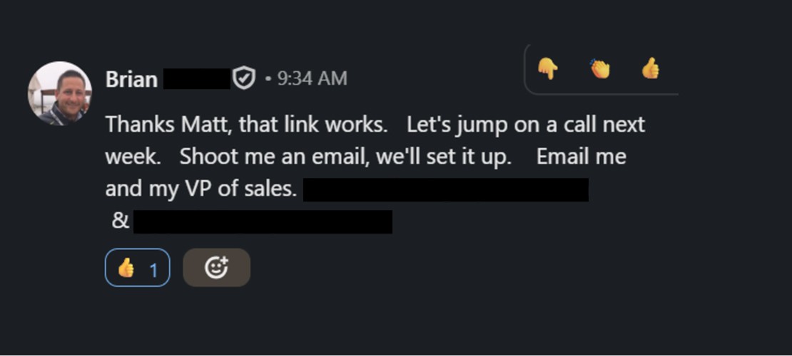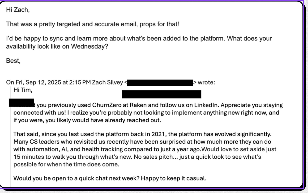 This approach works because it proves you paid attention. You're not sending a generic message to a name on a list. You're engaging with something they actually said. That proof of attention earns attention in return.
